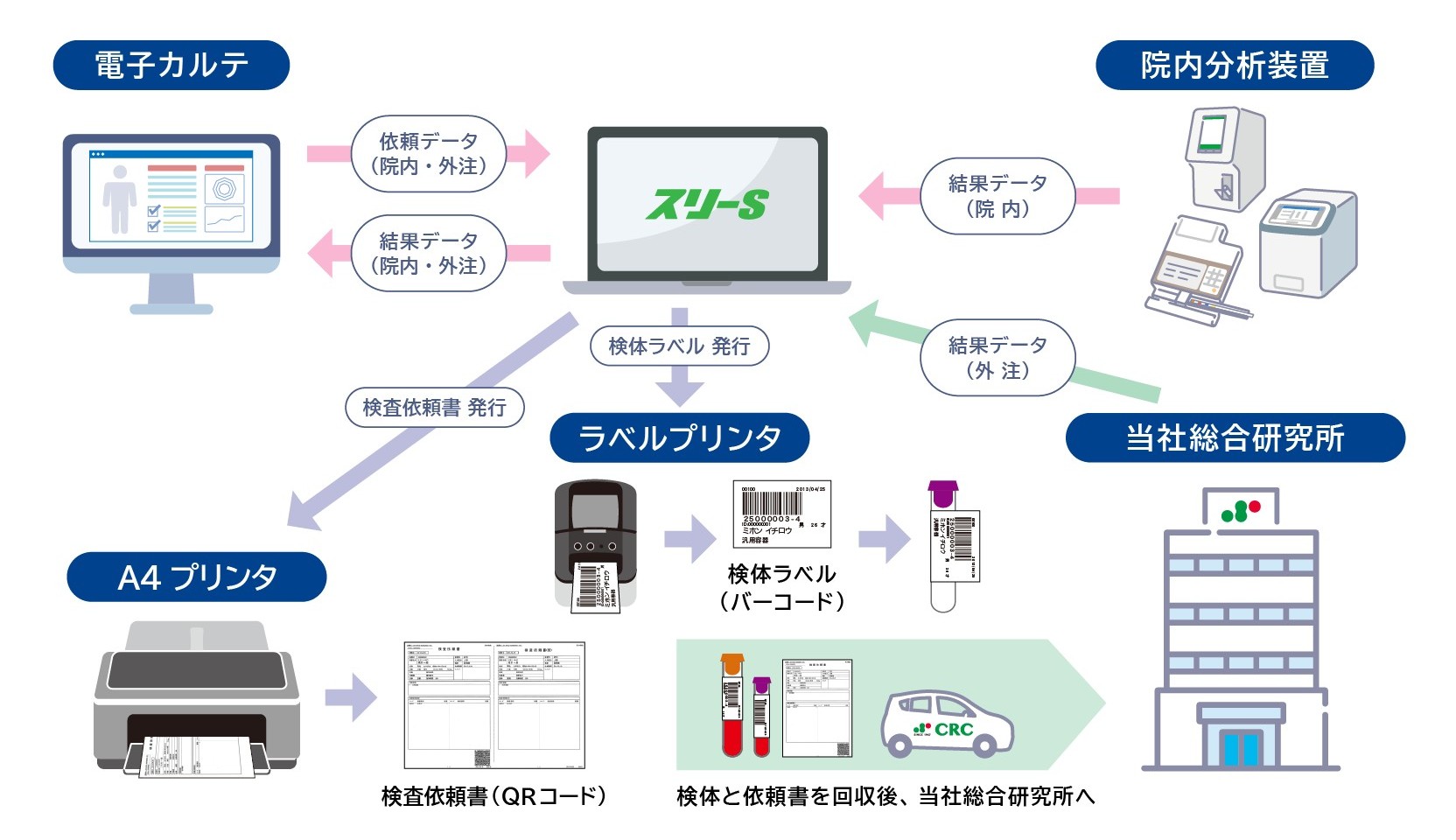 電子カルテに検査オーダーを入力すると、必要な検査依頼データのみが「スリーS」へ送信され、プリンタからはQRコード付きの検査依頼書が、ラベルプリンタからは検体ラベルが出力されます。
